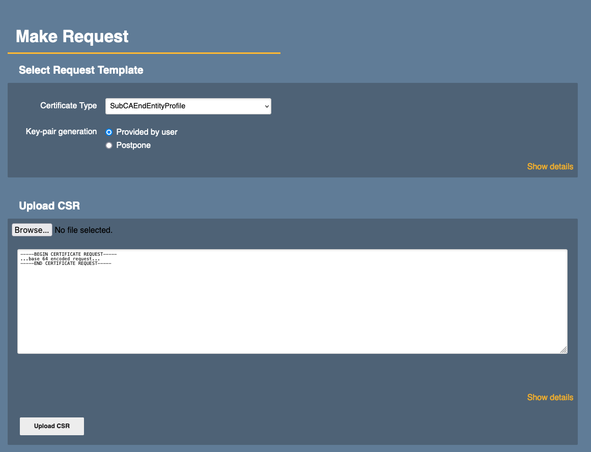 Key-pair generation: make sure Provided by user is activated. - Upload CSR