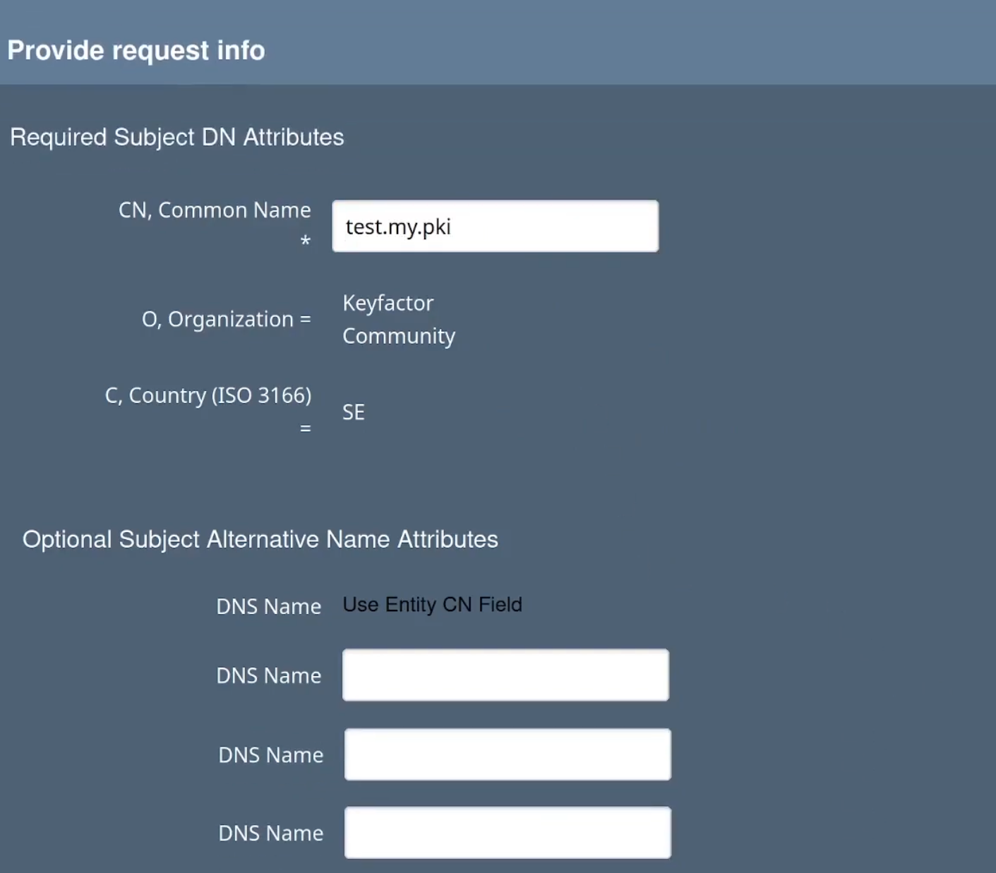 In the Provide request info section, you can verify that EJBCA picked up the common name from the CSR and that the optional DNS Name fields added to the profile are shown.