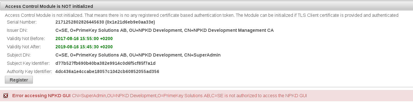 NPKD is initially installed without any registered user. This access control state is considered non-initialized and NPKD application cannot be accessed.