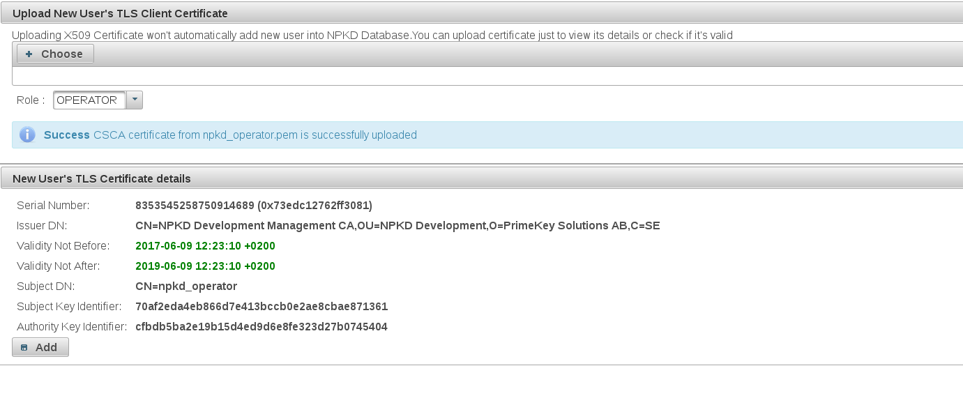 Warning: NPKD does not store administrators' certificate data beyond the serial number. This means that it is not possible to check whether an administrator's certificate is expired or revoked. An expired certificate, however, will not pass the TLS handshake