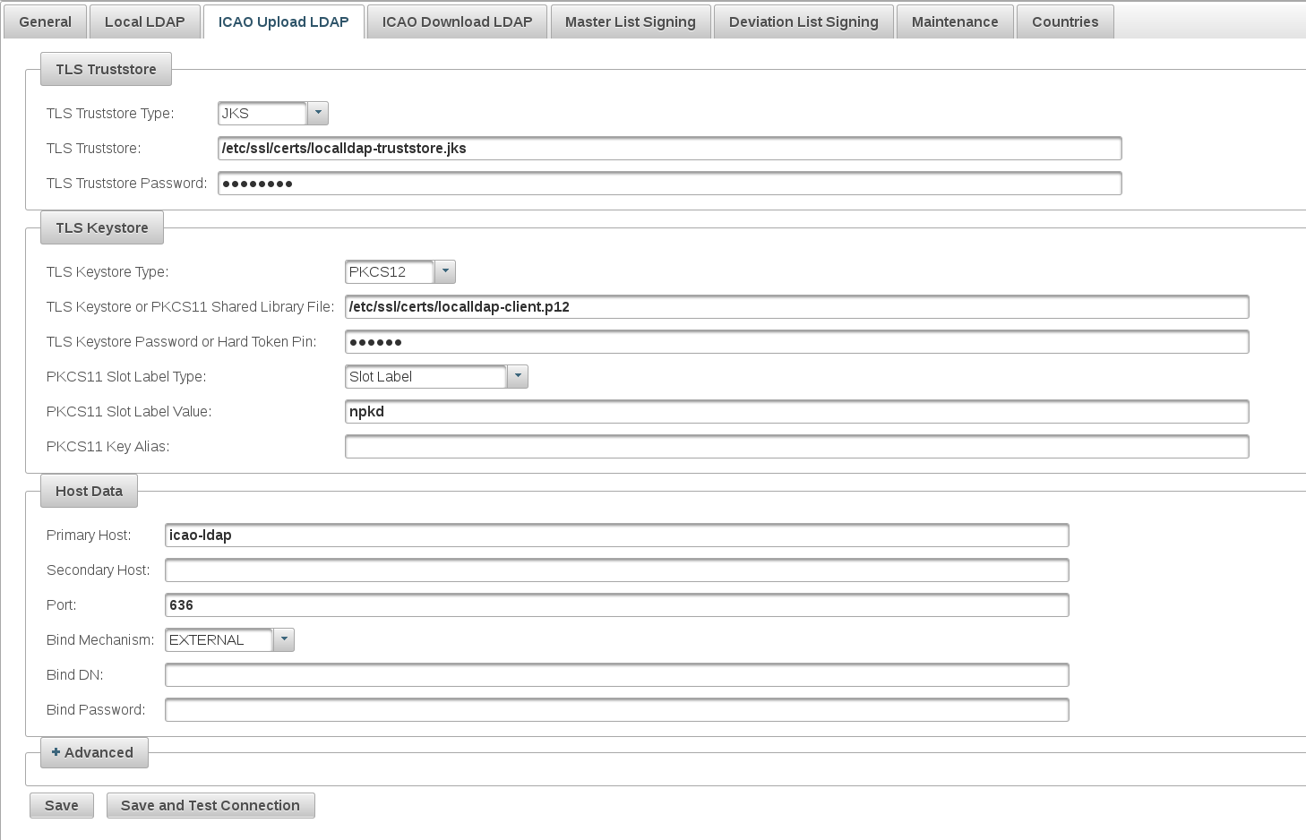 The ICAO Upload LDAP page allows Administrators to configure the connection to ICAO Upload PKD.