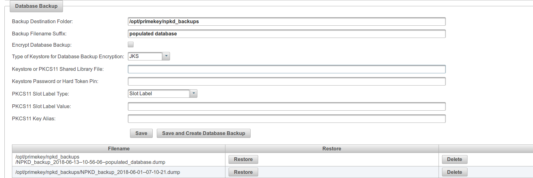 - Keystore or PKCS11 Shared Library File: The full path of the keystore file containing the RSA key used to encrypt/decrypt the database backup file, or the path to the shared library file (.so file) specific for the installed HSM; or a SUN configuration file.