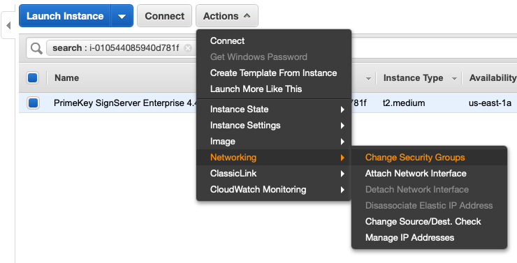 Select your SignServer Cloud Instance (or right click on it) and select: Networking > Change Security Groups.