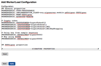 4. In the Configuration, comment out the line WORKERGENID1.DEFAULTKEY=signer00003 since we want to use our own key, and click Apply.