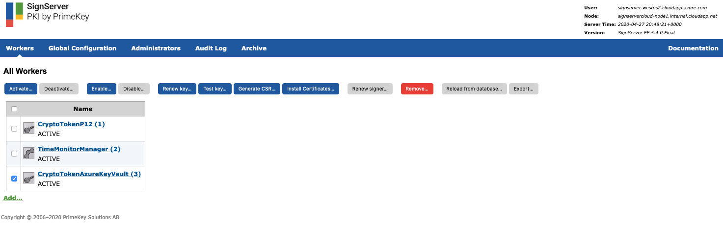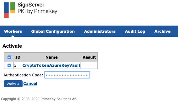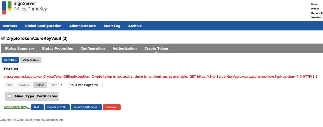 The following provides instructions for creating an Azure Key Vault Crypto Token in SignServer and how to manually activate the newly created Crypto Token if required.