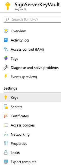 Click Keys in the Azure Key Vault created to be used with SignServer, in this example SignServerKeyVault (created in the Creating an Azure Key Vault step).
