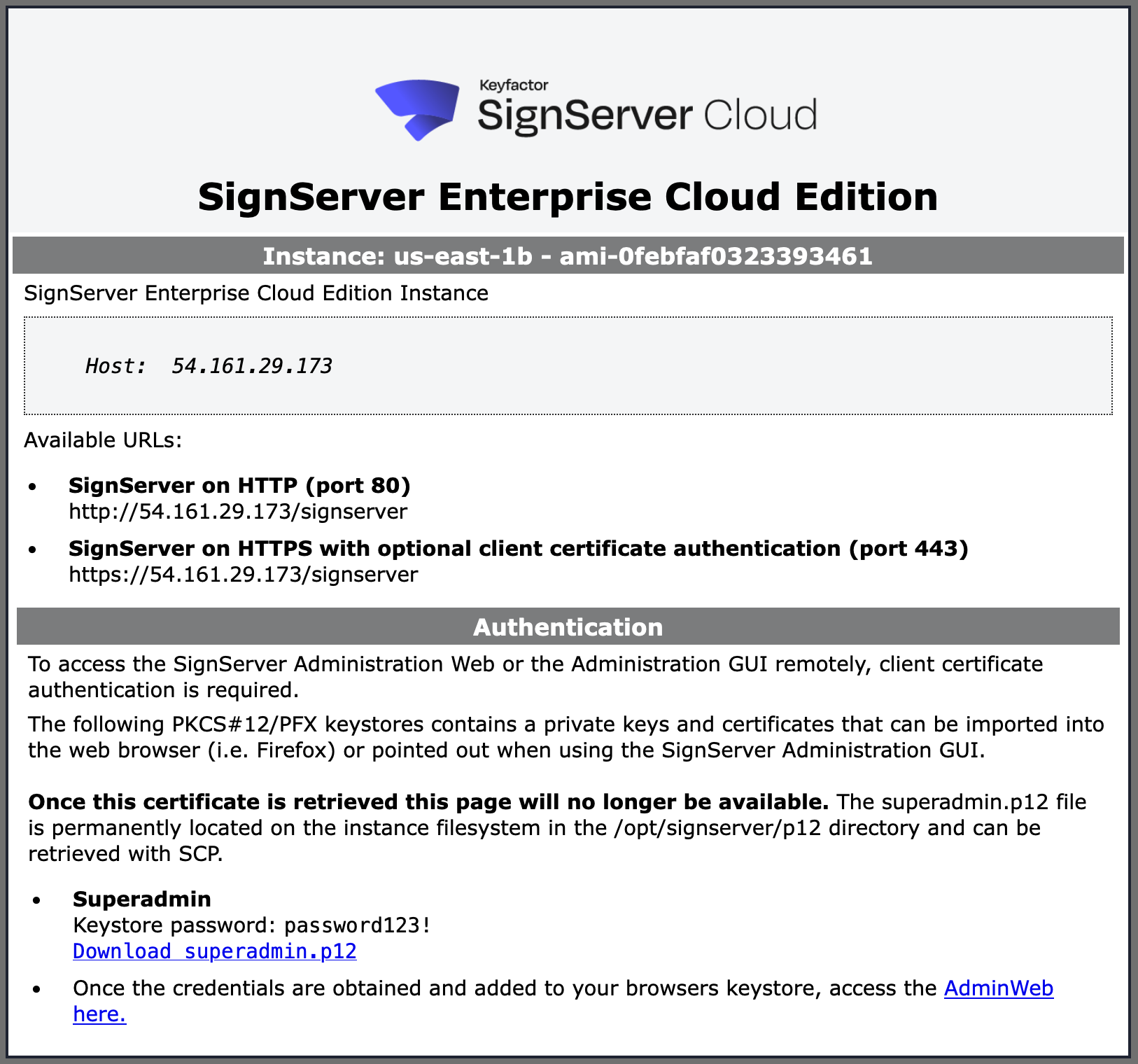The landing page of the SignServer Cloud Instance will be accessible until the SuperAdmin keystore is downloaded from the instance. To get the superadmin.p12 file from your instance do the following:
