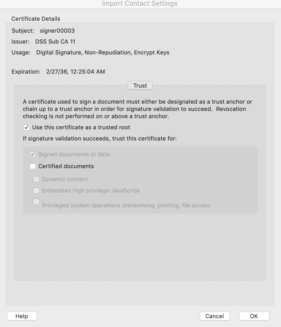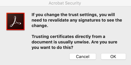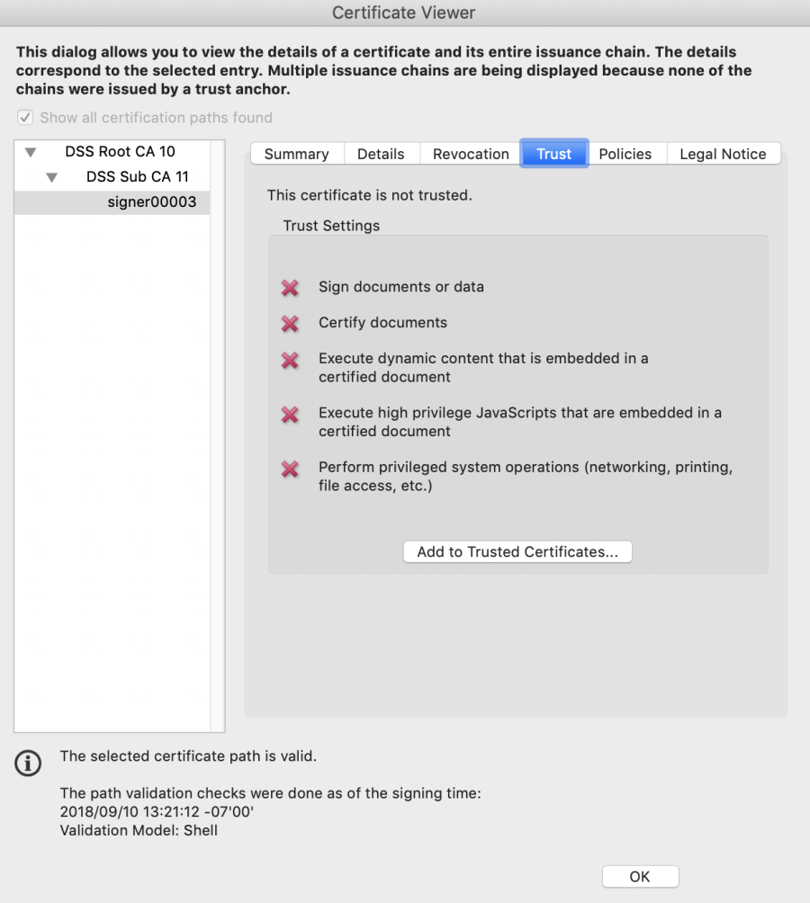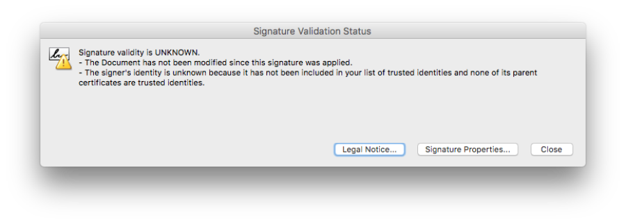 Adobe Acrobat Reader shows that the PDF is signed by a source but that it "has problems". This is because it does not know of our signer certificate.