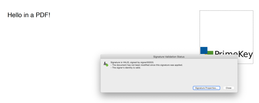 Select the PrimeKey logo in the PDF to view the Signature Validation Status with information on the valid signature: