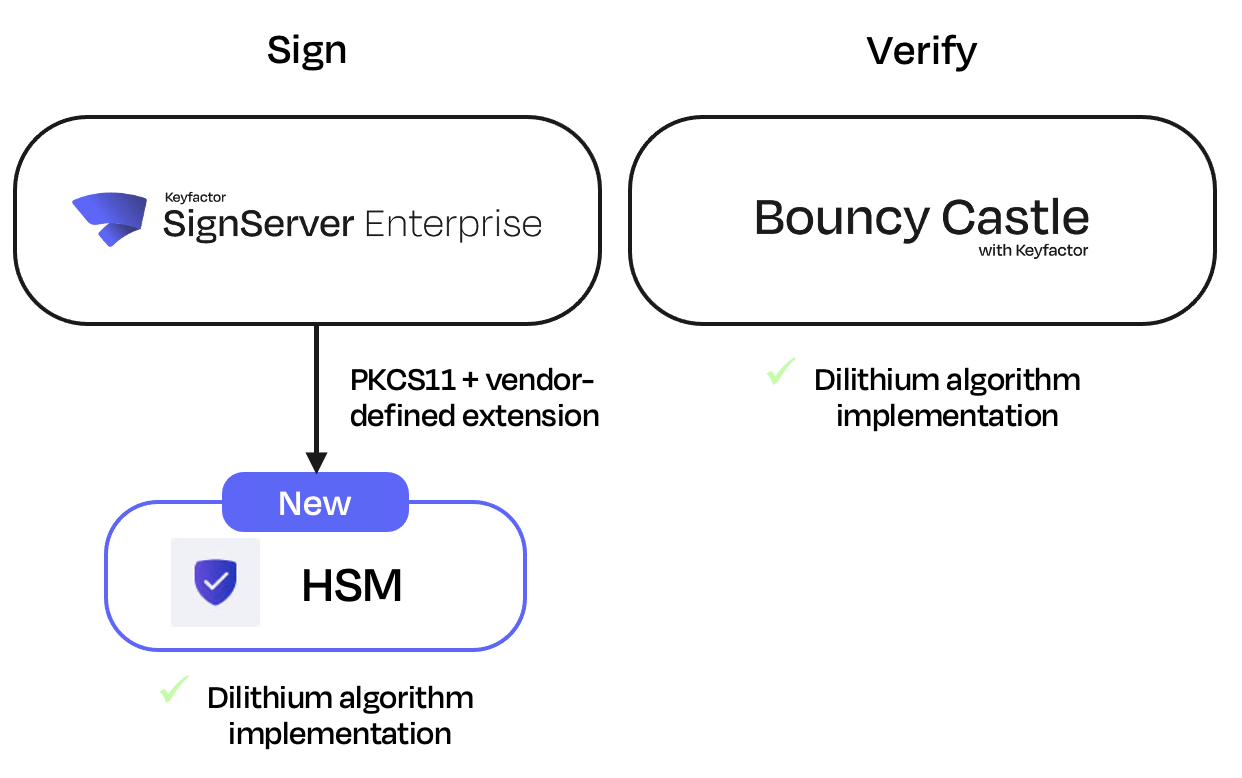 SignServer supports the Dilithium and SPHINCS+ NIST post-quantum candidate algorithms since SignServer 6.0. SignServer 6.2 now introduces support for the use of a hardware security module (HSM) with support for the Dilithium algorithm. Since Dilithium is not part of the PKCS11 standard, it requires an HSM vendor-defined extension in the PKCS11 interface. For information about supported HSM vendors and models, contact Keyfactor.