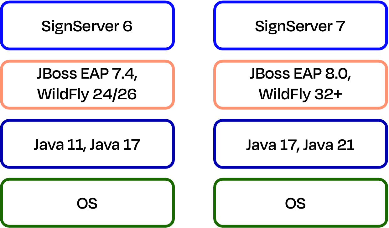 As a Java application running on an application server, SignServer 6.3 runs on WildFly 24/26 or JBoss EAP 7.4 and supports running on Java 11 or Java 17. Due to changes in recent WildFly versions and JBoss EAP 8 that are not backward compatible with WildFly 26 and JBoss 7.4, the upgrade from SignServer 6 to the upcoming new major version SignServer 7 will require a complete tech stack upgrade.