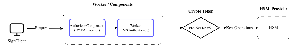Workers needing private keys do not talk directly to HSMs or Keystores. Instead, they use a Crypto Worker with a configured Crypto Token which abstracts the crypto backend.