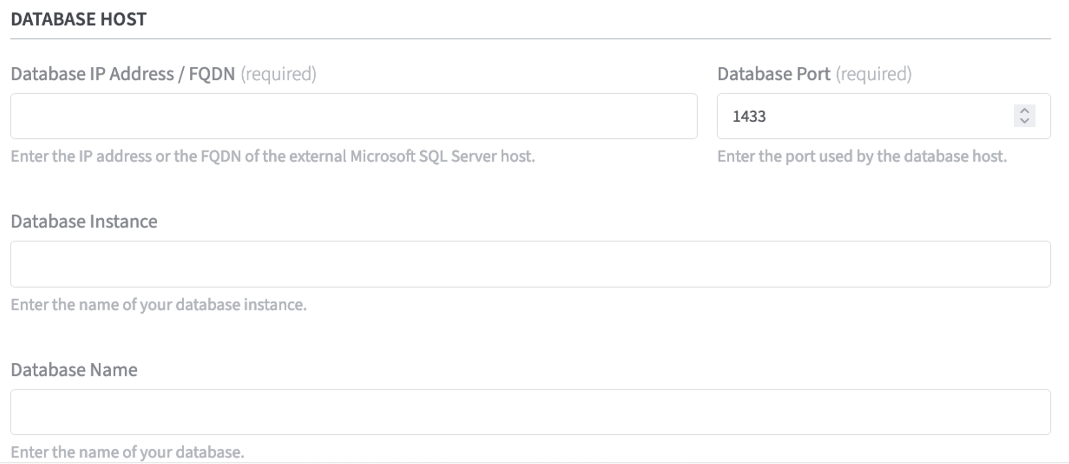 Database IP Address / FQDN (required): Enter the IP address or the FQDN (Fully Qualified Domain Name) of the external Microsoft SQL Server host.