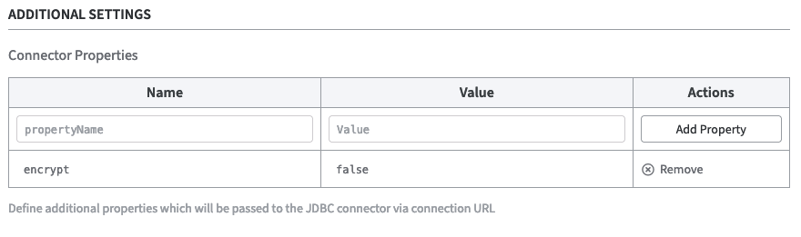 Here you can define additional properties. These are passed to the JDBC connector via the connection URL. These properties give you better control over the database connection.