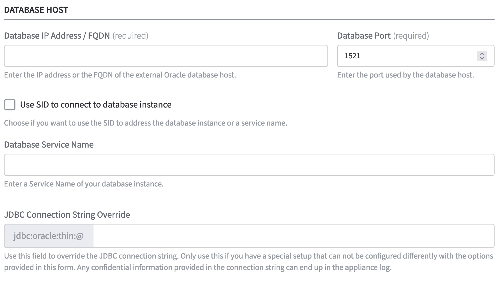 Please note that any kind of confidential information contained in the JDBC Connection String Override can be included in the appliance log.For details on the corresponding commands, please consult your Oracle Database documentation.