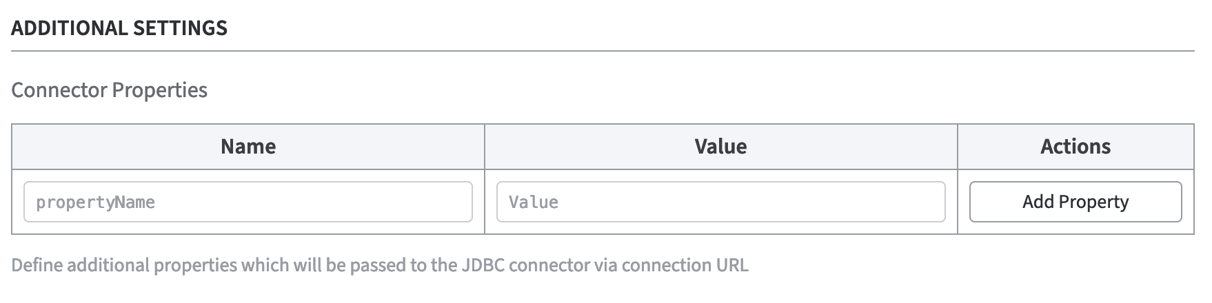 Here you can define additional properties. These will be passed to the JDBC connector via connection URL.