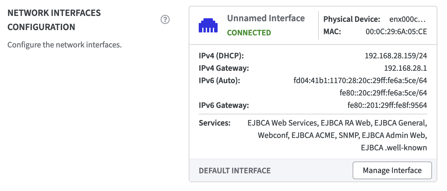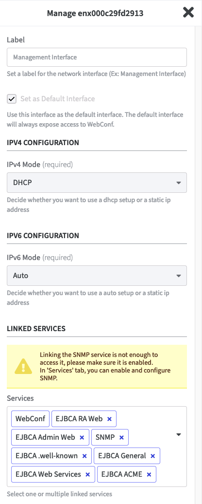 The section Network Interfaces Configuration, displays all the network interfaces that have been set up through the hypervisor. When the Software Appliance is started for the first time, it identifies the first interface and designates it as the Default Interface with all services enabled. Of course, this can also be configured subsequently. On the Default Interface, at least the WebConf service is always activated.