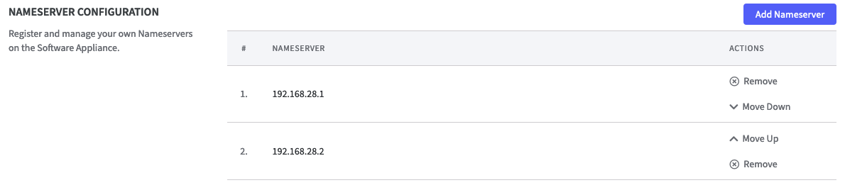 If multiple nameservers are configured, the Software Appliance attempts to resolve with all specified servers. This happens in order. If the first server does not respond, the Software Appliance attempts to resolve with the second, and so on. To change the order of nameservers, use the Move Up/Move Down function that appears in the Action column.