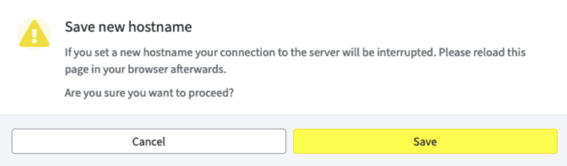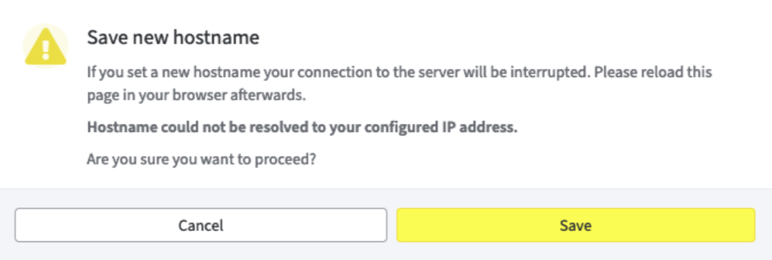 If the hostname entered cannot be resolved via the configured name servers, a different warning will appear.