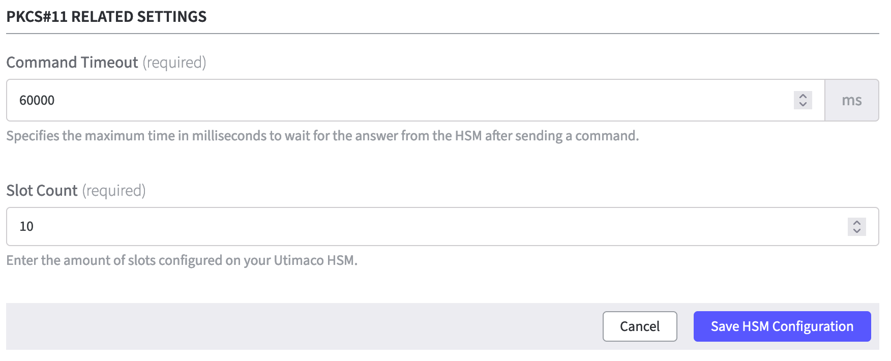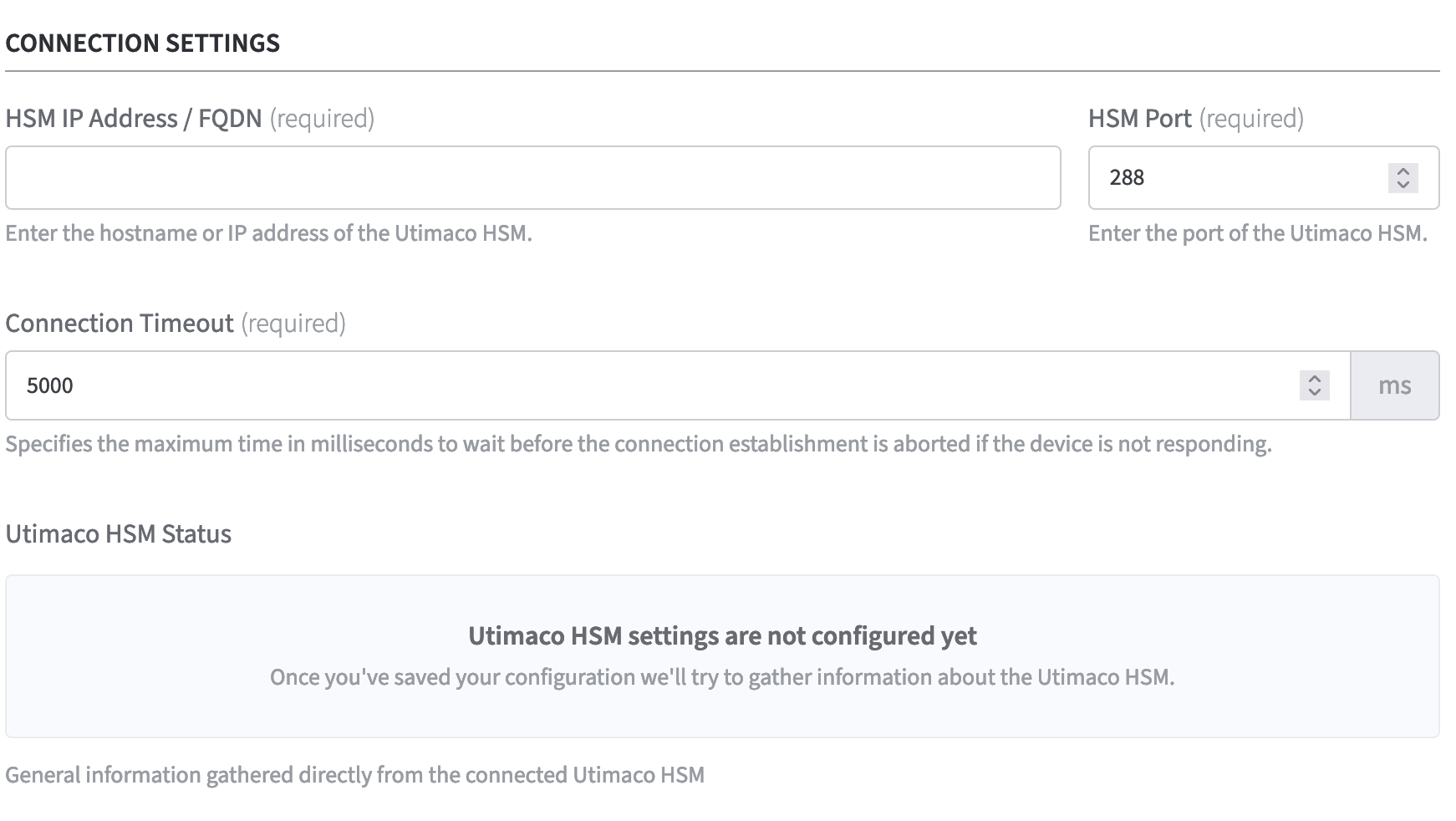 In the HSM Configuration section, select Utimaco HSM to access the Configuration fields.
