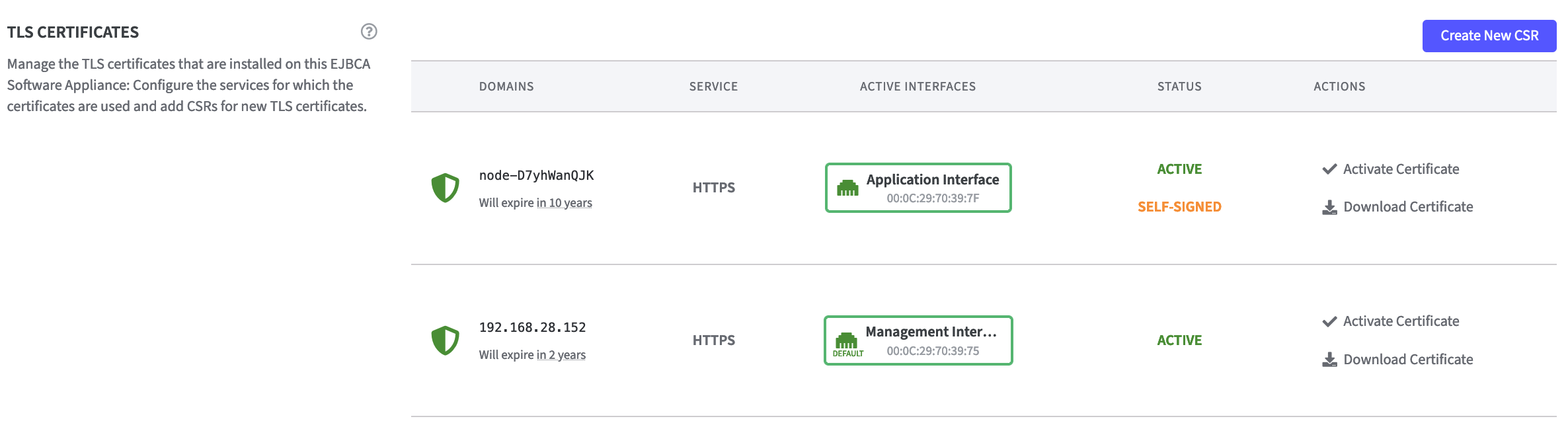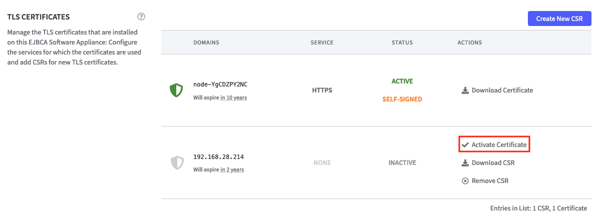 - In the TLS CERTIFICATES section, click Create New CSR to open the corresponding form.