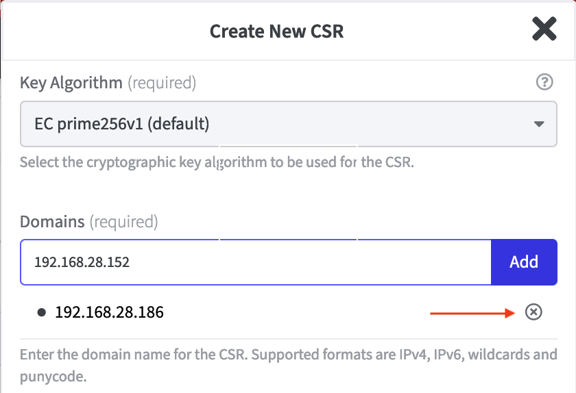 Add Domains. You can enter any IPv4 or IPv6 address in the entry field. The field also supports any domain name as well as wildcard domains and punnycodes.