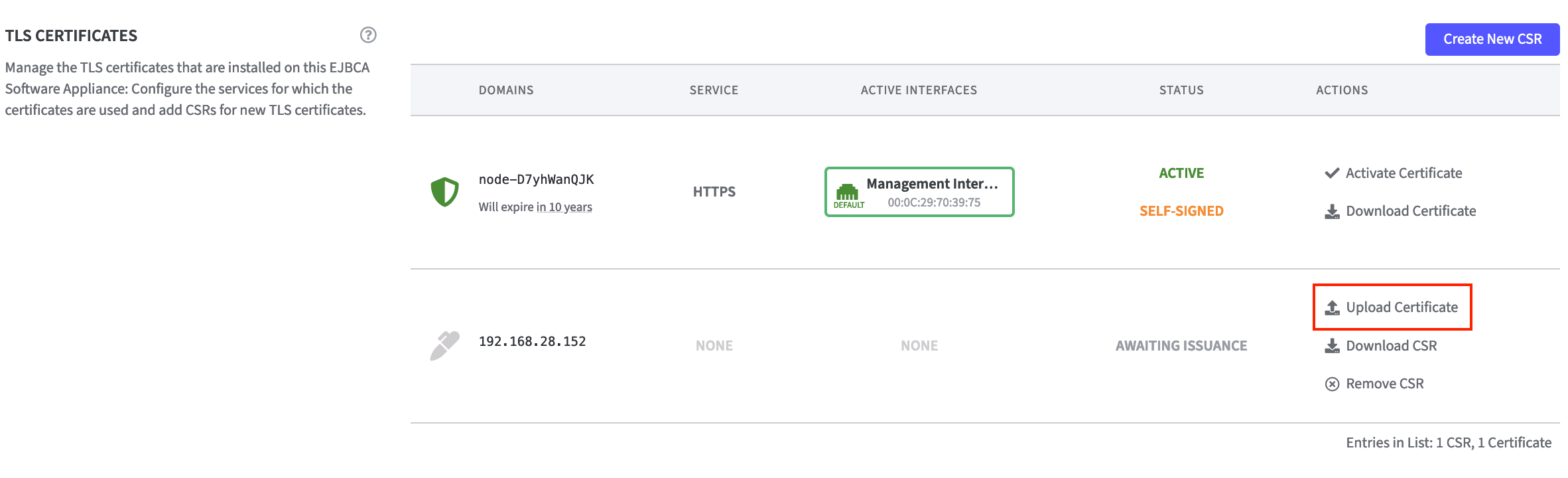 In the section TLS CERTIFICATES, click Upload Certificate for the certificate that is waiting for issuance: