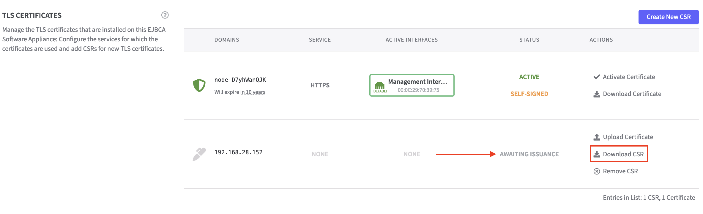 The TLS Certificates are listed now in a table. A Status column for the certificates is displayed in the list. AWAITING ISSUANCE should be stated here. - Click Download CSR in the in the Actions column, to download and save the new CSR