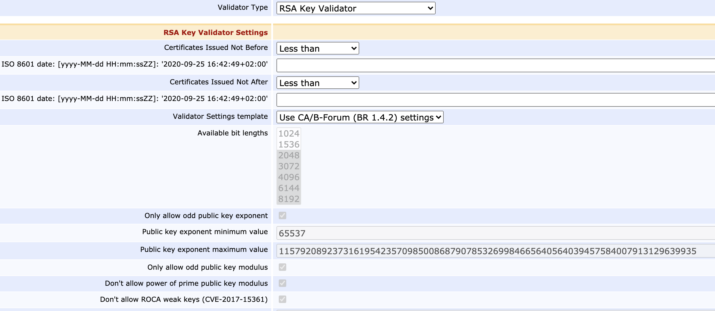 Throughout the issuance process, from a public key being sent in, to the certificate being issued, you'll likely want to ensure that the key you are signing passes basic security checks. You can do this by attaching Validators to your CA configurations.