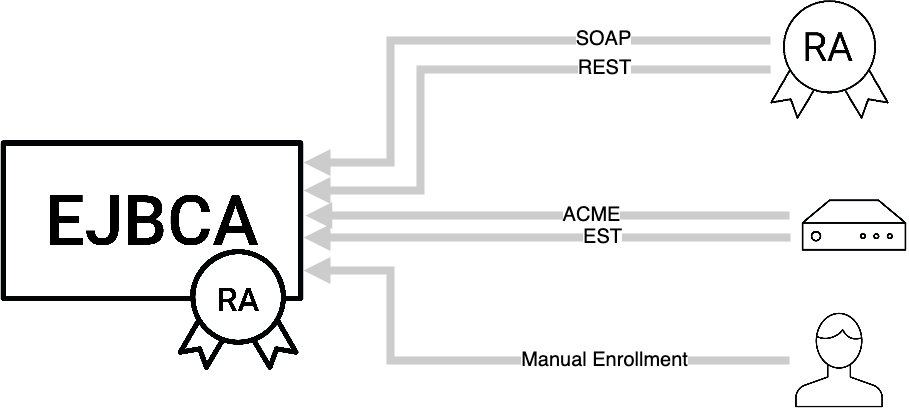 Whatever case(s) that may apply to your PKI, you likely want to process an enrollment request through a Registration Authority (RA) to avoid exposing your CA to the world at large. As with the VA above, your RA(s) are going to be connected to the CA over the Peers protocol. You are free to use the same EJBCA instance as VA and RA if you wish.