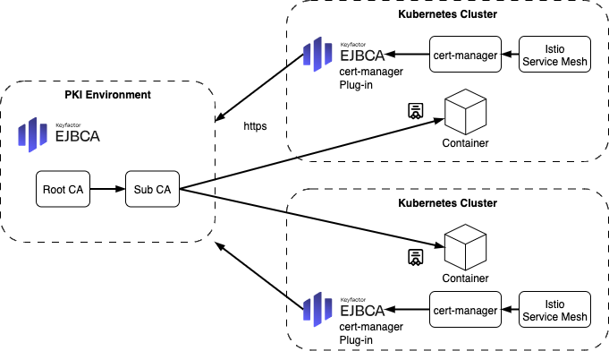 EJBCA PKI enables secure service mesh communication (e.g., Istio) and securing infrastructure components such as admission controllers, webhooks, and API servers.