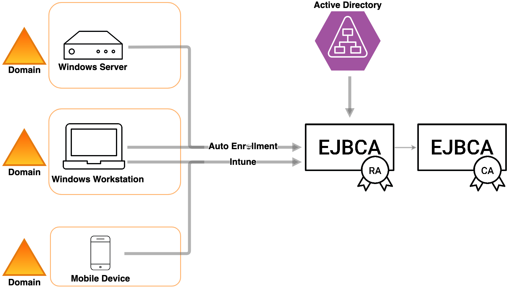 PKI is an integral part of any Windows environment. Servers, workstations, and mobile devices are managed through Active Directory (AD), defining domains and access for users and machines. Backing this is the built-in Microsoft CA, which checks with AD running on a Domain Controller.