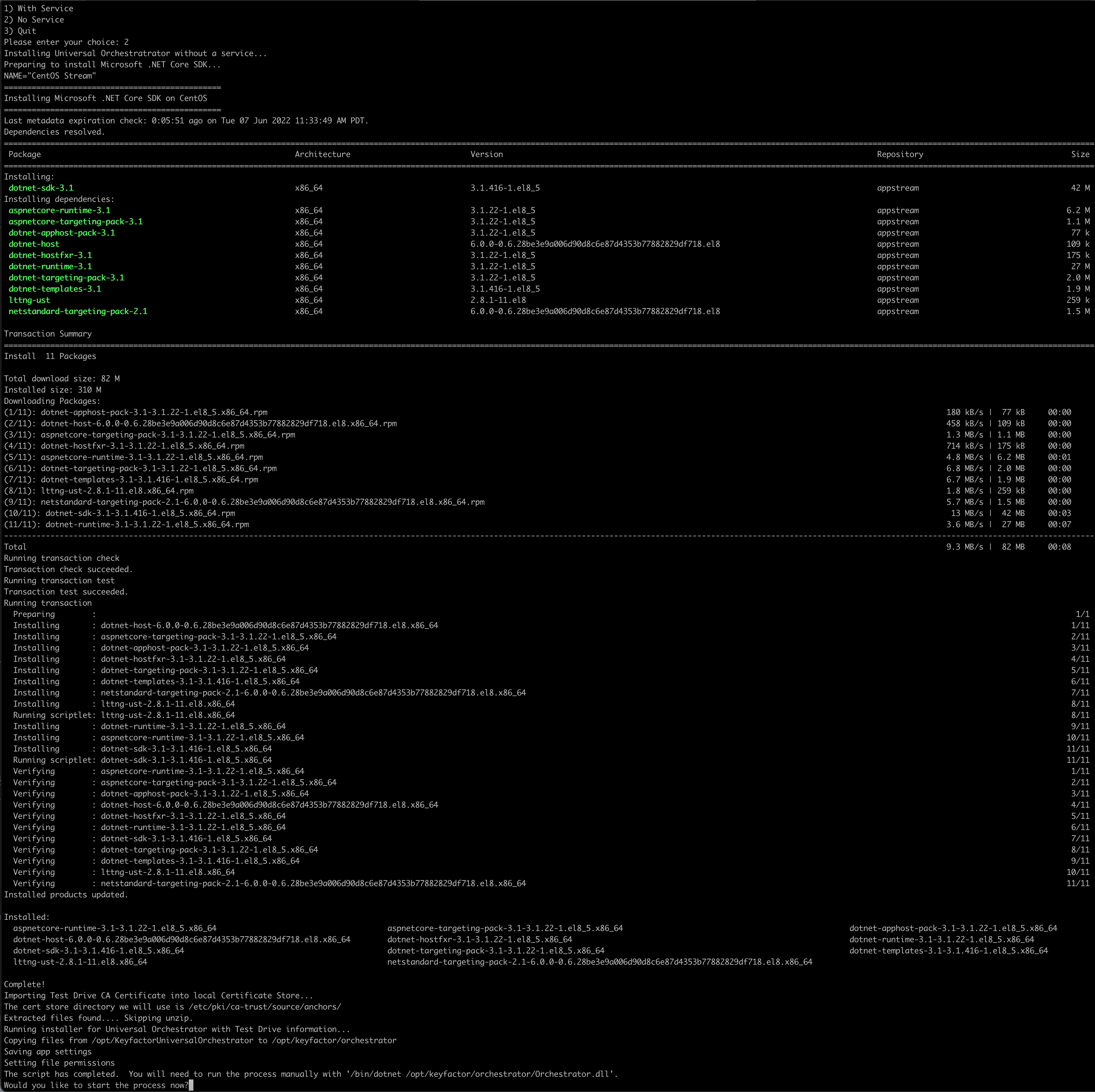 Selecting option 2 will install the Universal Orchestrator and run it in the current terminal session. First the script will install dotnet core 3.1 if it is not already installed. It might find some other dependencies that it also needs to install.