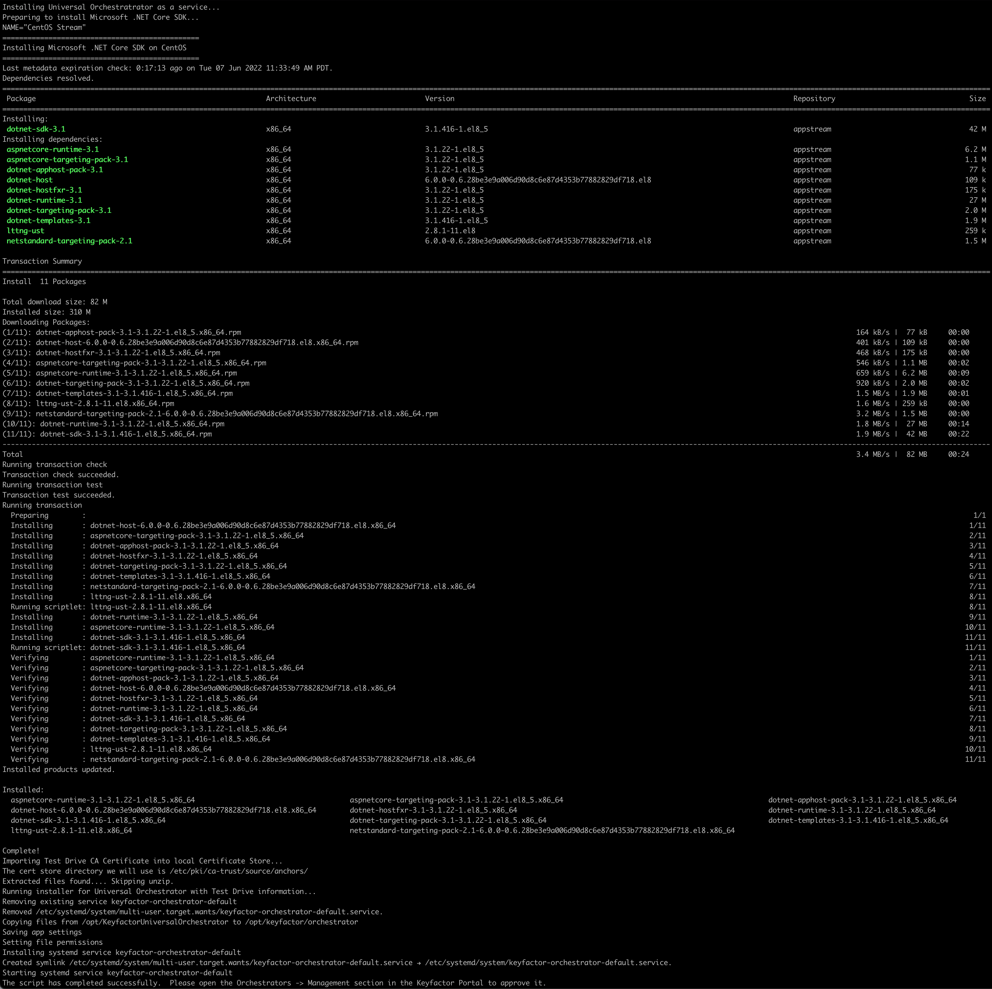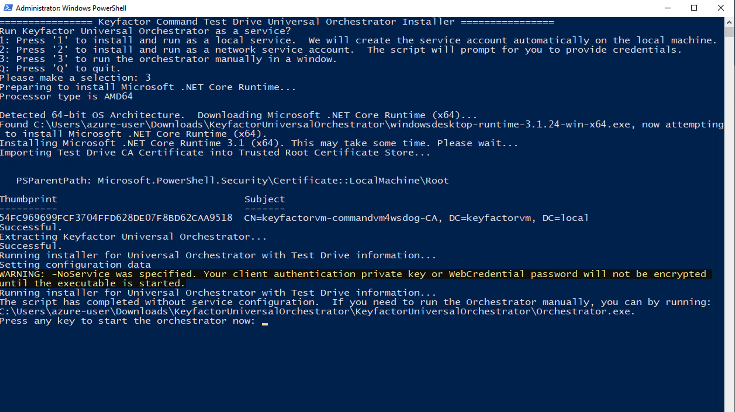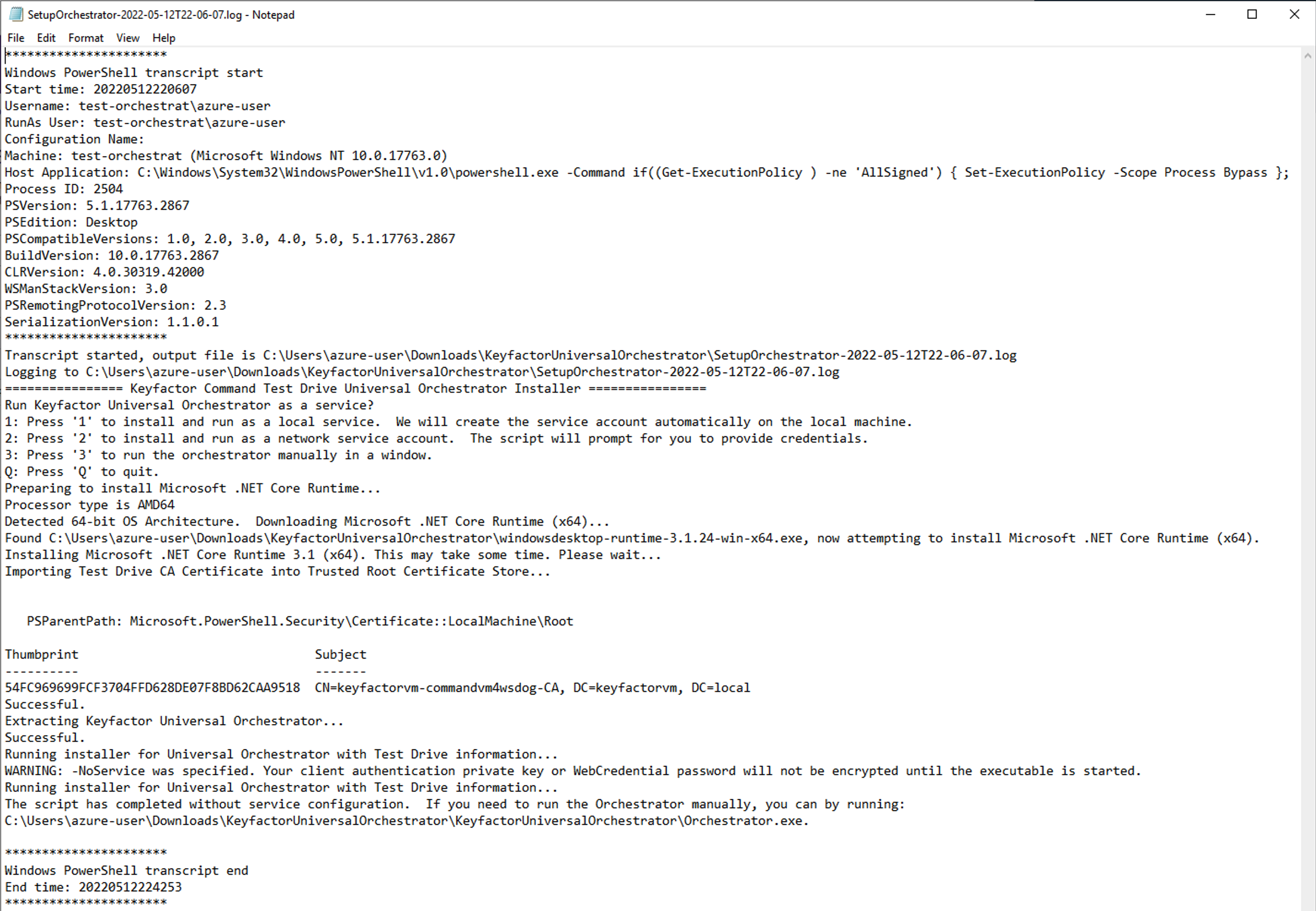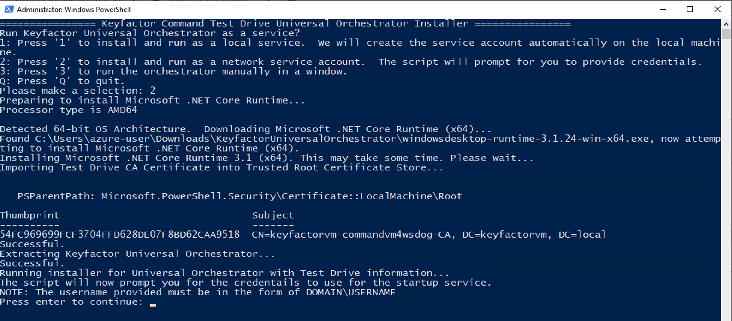 Selecting any of the options will check to see if “.NET Core 3.1” is installed. If it is not, the script will automatically install either the 32-bit or 64-bit version for you depending on your system. If it is already installed, but in a non-default location, it will still download the installer, but skip installation. After this it will add the public certificate for the Test Drive into the local Trusted Root Certification Authorities computer store. Then it will extract the Keyfactor Universal Orchestrator and configure it. If you need access to the setup or Orchestrator logs, refer to Appendices 2 or 3.