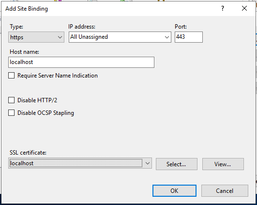Select https for the binding Type and leave the port set to the default of 443. Enter a hostname, if desired. In the SSL certificate dropdown, select the certificate that was just imported in the previous steps. Click OK.