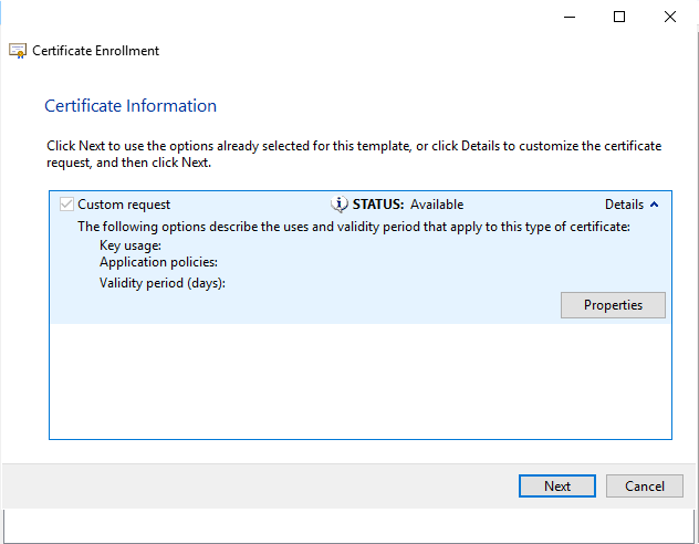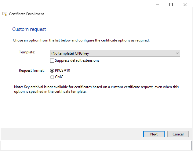 Select (No Template) CNG key for the Template and PKCS#10 for the Request format. Click Next.