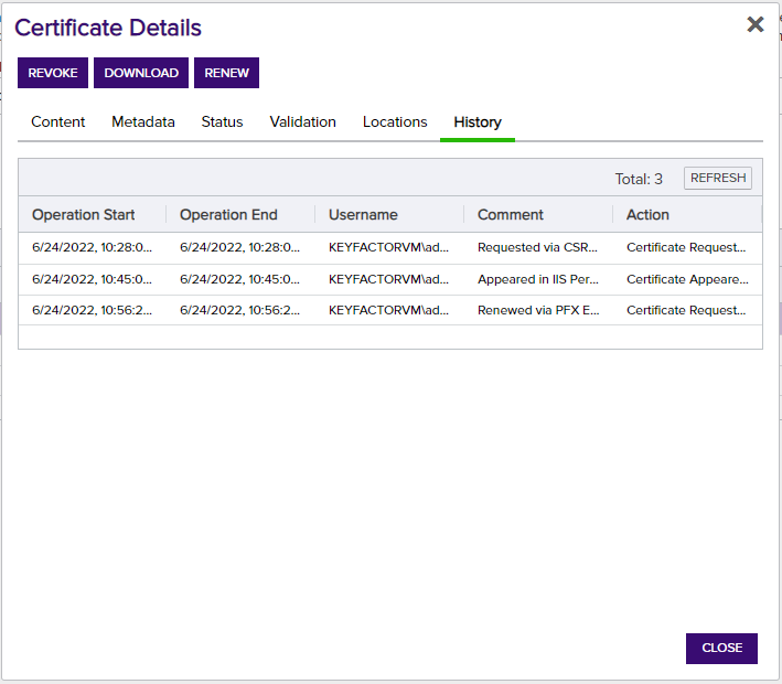 double-click on the renewed certificate from the list of certificates in the collection. Clicking on the History tab will show that the certificate was successfully renewed. Make note of the renewed certificate serial number. Once the Universal Orchestrator connects back to the Keyfactor Command Test Drive, the renewed certificate will be installed into the IIS web server and the Bindings will be updated to use the renewed certificate. Compare the serial number in the certificate from the collection with the serial number of the certificate in the IIS Bindings to confirm that the renewed certificate was successfully installed in the web site.