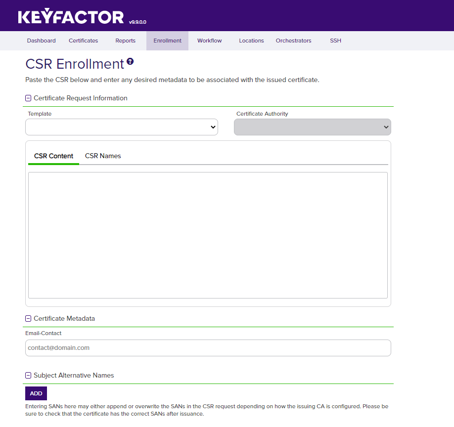 Connect to your Keyfactor Command Test Drive and navigate to the Enrollment -> CSR Enrollment page from the drop-down menu.
