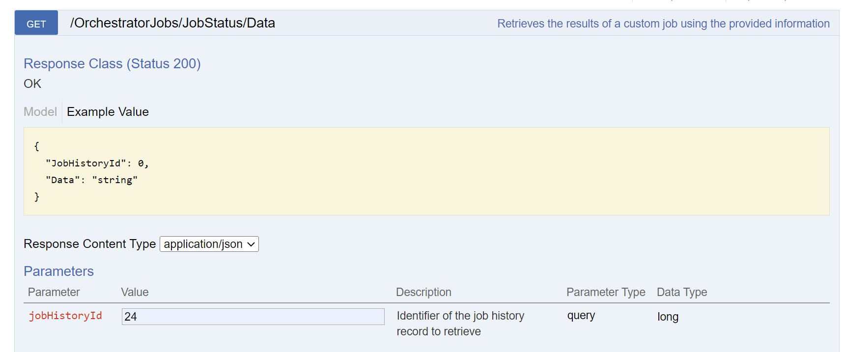Using the JobHistoryId in the API endpoint GET /OrchestratorJobs/JobStatus/Data, then click Try it out!.