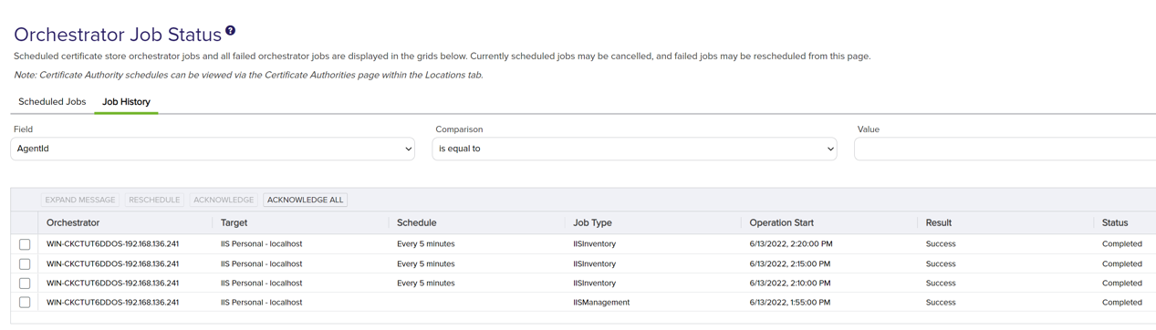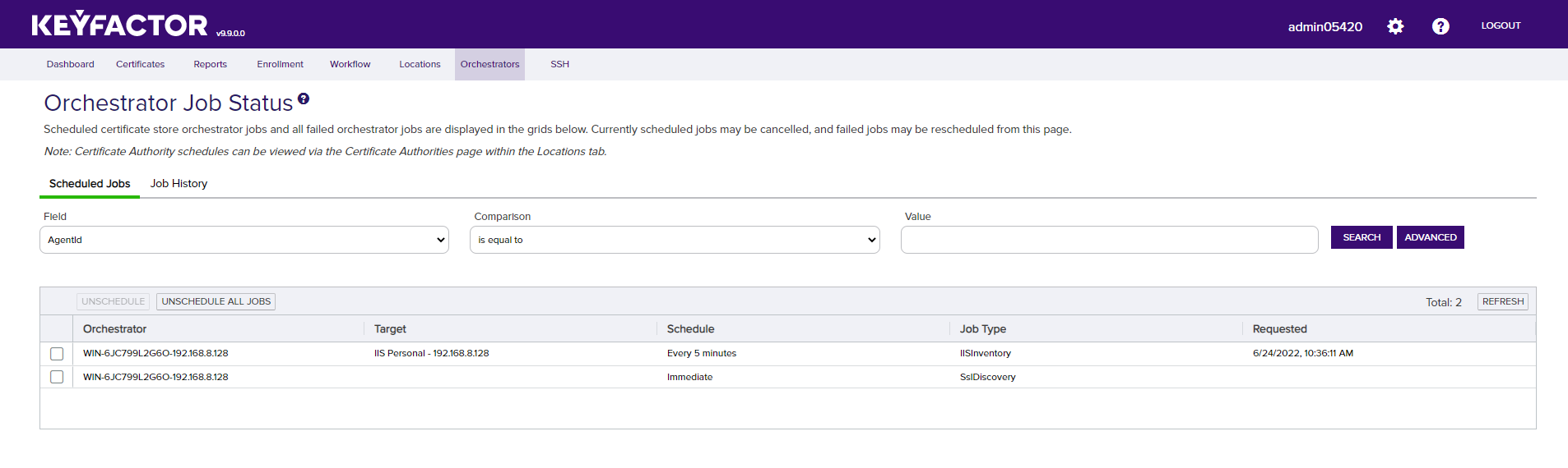 In the Keyfactor Command console, select Orchestrator -> Jobs from the navigation menu bar. The list of jobs should contain the job that was configured in the previous step. It may take up to 5 minutes for the Universal Orchestrator to pick up the new inventory schedule from Keyfactor Command. Once the Universal Orchestrator completes the job, the results will show up in the list on the Job History panel of the Orchestrator Job Status page.