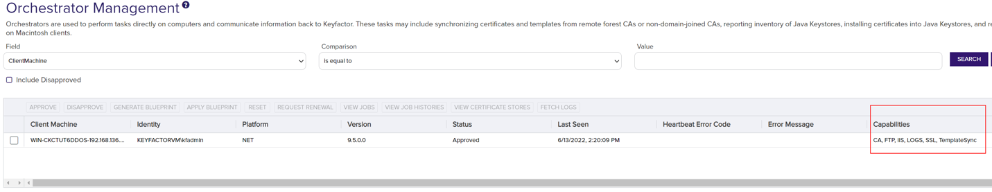 An important thing to note is the orchestrator Capabilities which can be seen in the orchestrator grid. These capabilities default to CA, FTP, IIS, LOGS, SSL, and TemplateSync for Windows based Universal Orchestrators and FTP, LOGS, and SSL for Linux based Universal Orchestrators. Refer to the next sections to learn how to use each of these capabilities.