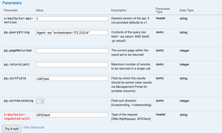 Click Try it out! and see the information displayed. After finding the fetch logs job, copy the JobHistoryId to be used in the next API call.